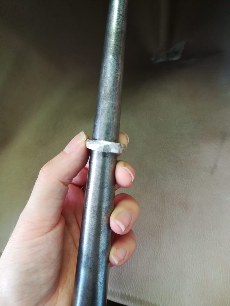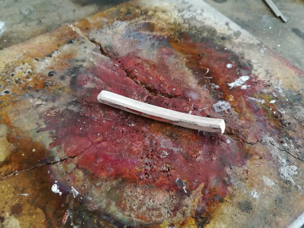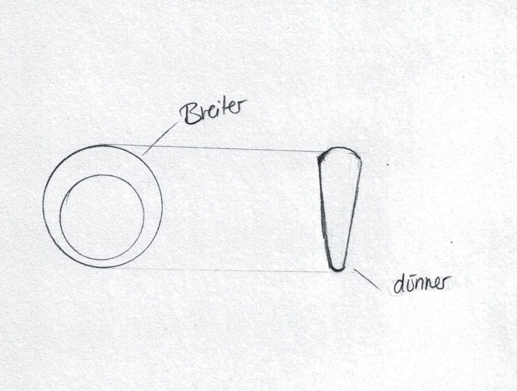 Wie auch beim Zungenschienenring, markierte ich mir mit Edding zunächst die Mitte des Walzprofils. Diesmal begann ich jedoch nicht von der Mitte des Walzprofiles aus in beide Richtungen auslaufend zu walzen, sondern ließ gerade diesen Bereich unangetastet. So walzte ich stattdessen jeweils von beiden Enden des Walzprofils abwechselnd und reduzierte immer wieder den Abstand der Blechwalze, um die Materialstärke zu seinen Enden hin auszudünnen. Wichtig ist es, das Walzprofil zwischendurch zu glühen, damit das Material weich und formbar bleibt. Nach Abschluss der Walzarbeiten blieb damit ein Profildraht, dessen Mittelpunkt noch die Anfangshöhe hatte und der gleichmäßig auslaufend zu beiden Seiten hin immer dünner wurde.