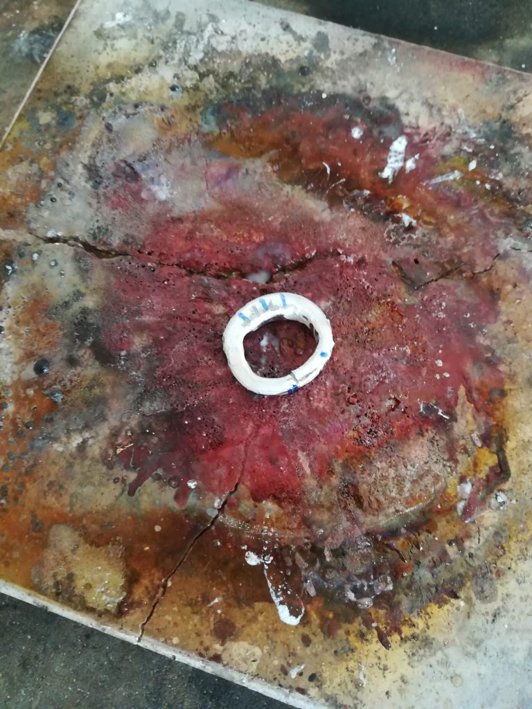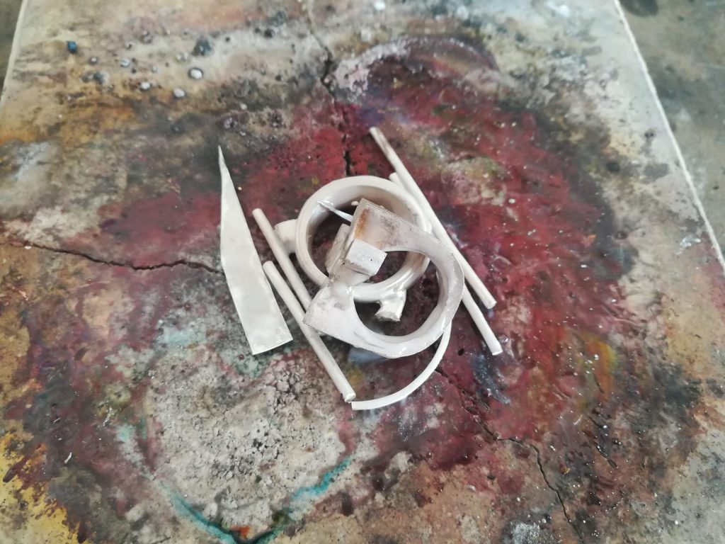 Für die Fertigung meines eigenen Bandrings stellte ich mir zunächst ein Walzprofildraht her. Dazu schichtete ich einen Altsilber-Haufen auf meiner Lötunterlage, deckte es gut mit Flussmittel ab und schmolz es zu einer länglichen Form.
