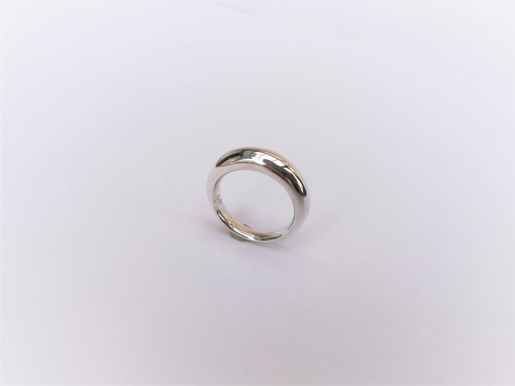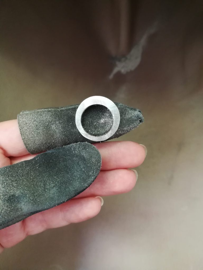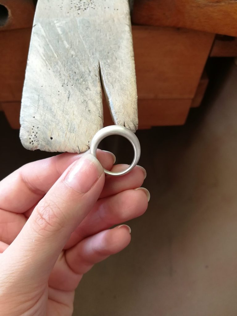Nach dem Feilen bombierte ich noch den Ring von innen und stempelte ihn. Zum Abschluss brachte ich eine Hochglanzpolitur auf die Oberfläche als Finish.