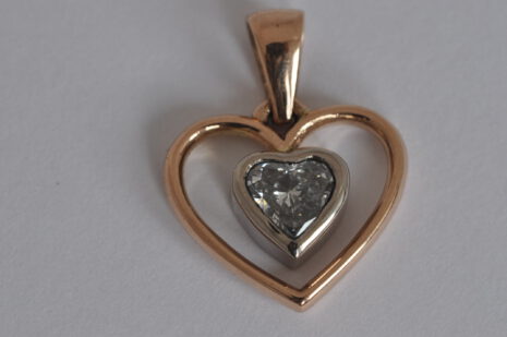Diamanten in Tropfenform verarbeiten wir nicht so häufig, wie runde Brillanten. Eine weitere seltenere Form beim Diamanten ist das Herz. Aber auch herzförmige Diamanten haben wir schon – nach Kundenwunsch – zum Anhänger gearbeitet. Hier in einer Rotgold- Weißgold Kombination. Das Herz sollte zu weiteren Schmuckstücken passen, daher ist es streng gearbeitet. Unser Entwurf war weicher und mit beweglich aufgehängtem weißgoldenem Anhänger. Aber der Kunde hatte andere Wünsche und dann wird natürlich der Anhänger genau so gefertigt, wie es gewünscht wird. Das Ergebnis kann sich sehen lassen, oder?