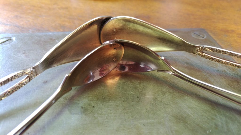 Aus altem, versilberten Besteck möchte ich ein Dekoherz, also einen Deko-Anhänger in Herzform, neu gestalten. Ich habe zwei lange Löffel und zwei kurze; sie sind jeweils mit Bernstein verziert – das könnte ein kleineres und ein größeres Herz ergeben, die an- oder ineinander hängen. Das überlege ich mir am Schluss.
