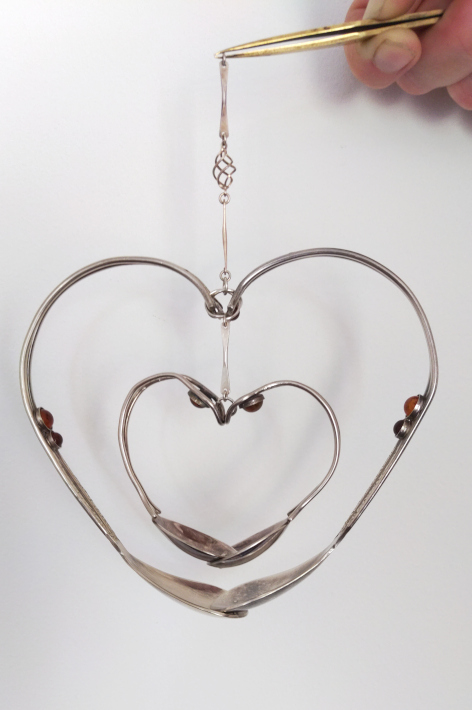 Parallel zu dem großen Herz entstand ein kleineres aus den beiden kleinen Löffeln. Sie sind ebenfalls an ihren Löffelschalen genietet und oben mit Ösen verbunden. Hier hatte ich zunächst gedacht, dass eine große Öse ausreicht – doch wegen der Optik in Verbindung mit dem großen Herz habe ich das noch einmal abgeändert und statt nur einer Öse zwei größere verwendet. Details machen etwas aus … Auch diese beiden Ösen sind mit einer kleineren verbunden. Hier wird gleichermaßen eine Aufhängung befestigt. Im Laufe des Arbeitsprozesses habe mich dafür entschieden, das kleinere Herz in das größere einzufügen. Dann ist mein Dekoherz fertig.