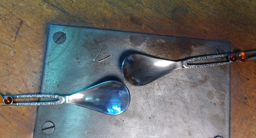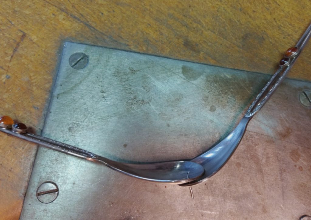 Nachdem die Nietenden fertig sind, erhalten die Besteckteile ihre Herzform. Im Schraubstock klemme ich eine Kugelpunze mit einem großen Durchmesser fest. Mit ihrer Hilfe bekommen die Löffelgriffe ihre Rundung. Das muss ganz vorsichtig vorgenommen werden, damit die Verzierungen aus Bernstein nicht aus ihren Fassungen springen. Der Bernstein ist nicht gefasst, er ist lediglich eingeklebt.