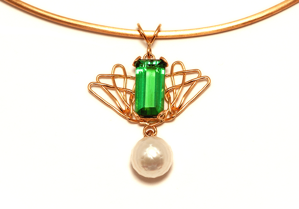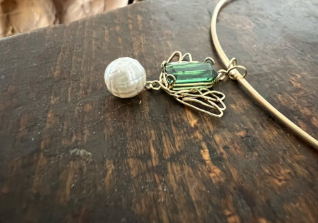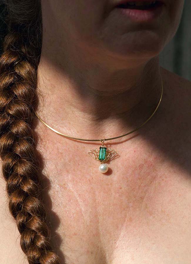 Das Collier „Elysian“ besteht aus 750er Gelbgold und besticht durch einen zentralen grünen Turmalin sowie eine facettierte Süßwasserzuchtperle. Die Kombination aus Gold, Turmalin und Zuchtperle ist eine Reminiszenz an den Jugendstil. Die filigrane Form, die Flechtarbeit aus zartem Draht und die Qualität des Edelsteines sowie der facettierten Perle spiegeln meine Vorstellung von modernen Schmuckvisionen wider.