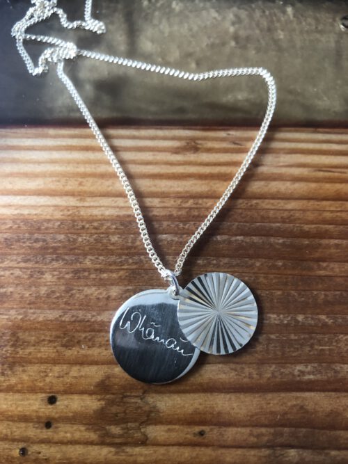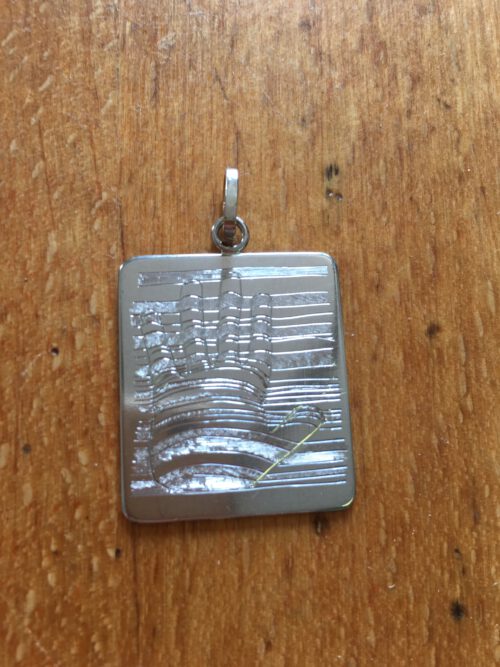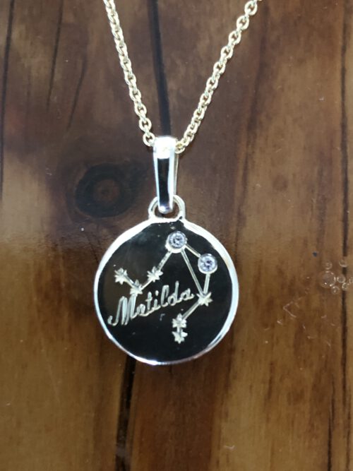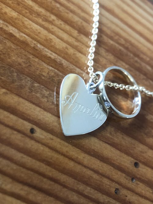 Anhänger sind auch eine gute Möglichkeit für eine Flachgravur. Ganz häufig sind es Namen, die die Graveurin dann in ein Plättchen sticht. Manchmal kommt die Vorlage für die exakte Form des Plättchens per Messanger, dazu wird die Gravur manchmal mit Brillanten kombiniert.