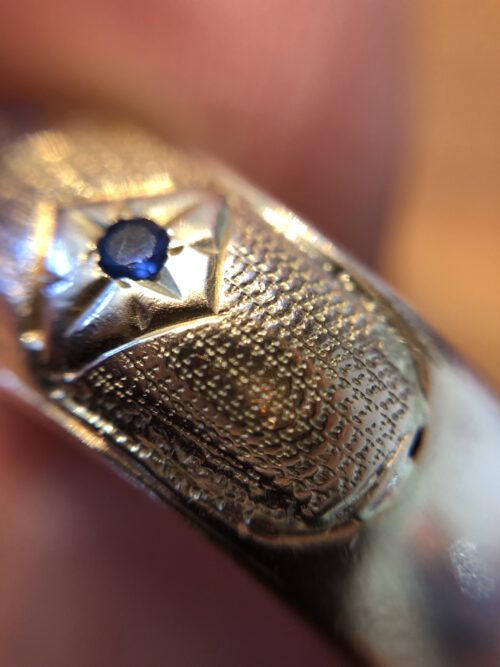 Der Ring ist unter der Lupe fotografiert, deshalb die Unschärfen am Rand. Ein Anhänger soll diesen Ring – nach ca. 50 Jahren – ergänzen, der zu der Art und dem Aussehen des Ringes passen soll. Angefertigt in BrittasSchmiede, graviert von einer Graveurin, die weiß wie es geht.