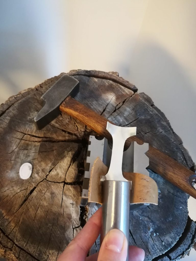 Im Anschluss legte ich die Abwicklung in die Riefenanke und erzeugte mit einigen Hammerschlägen auf dem Gegenstück eine Wölbung im Material an der oberen T-Zone. Danach wiederholte ich den Vorgang für den Ringschienenbereich. Mit einer Halbrundzange bog ich das restliche Material bis die Enden sich berührten. Dann lötete ich sie zusammen.