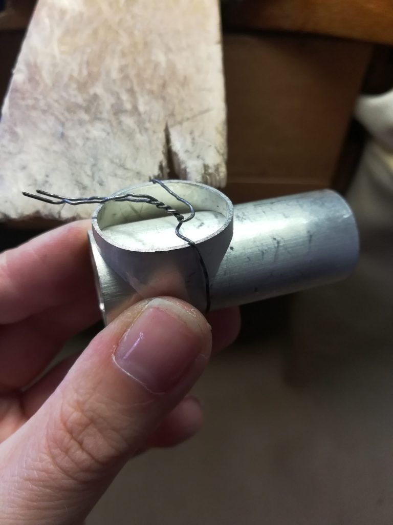Für den nächsten Schritt suchte ich mir ein passendes Rohr und steckte die Abwicklung darauf. Manche Stellen, die ich noch an der Form verändern wollte, markierte ich mit einem Edding und feilte sie. Sobald die Abwicklung Bündig mit dem Rohr passte, fixierte ich alles mit einem Bindedraht und lötete es zusammen. Danach sägte ich den Überstand des Rohres ab, sodass ich rundum ca. 1 mm Überstand hatte, damit sich das Lot nicht in die Fugen reinzieht und Kuhlen entstehen.