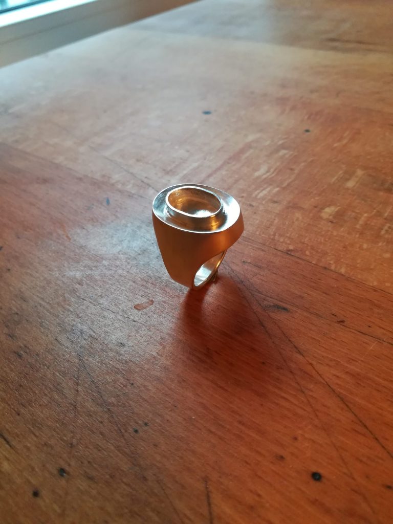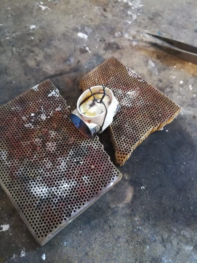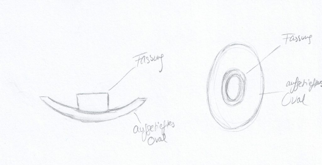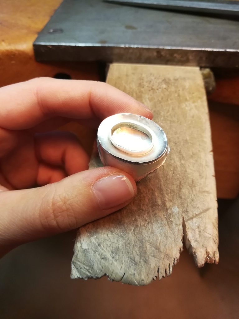 Für die Zarge suchte ich mir ein zur Steingröße passendes Rohr. Ich sägte es auf die gewünschte Höhe ab und erzielte eine Ovale Grundform in dem Schraubstock. Danach veränderte ich mit einer Halbrundzange die Ovale Zarge im Detail, bis er für die Steinform passte. Die untere Fläche der entstandenen Fassung feilte ich passend zum aufgetieften Ringdeckel. Danach lötete ich die Fassung in den Deckel.