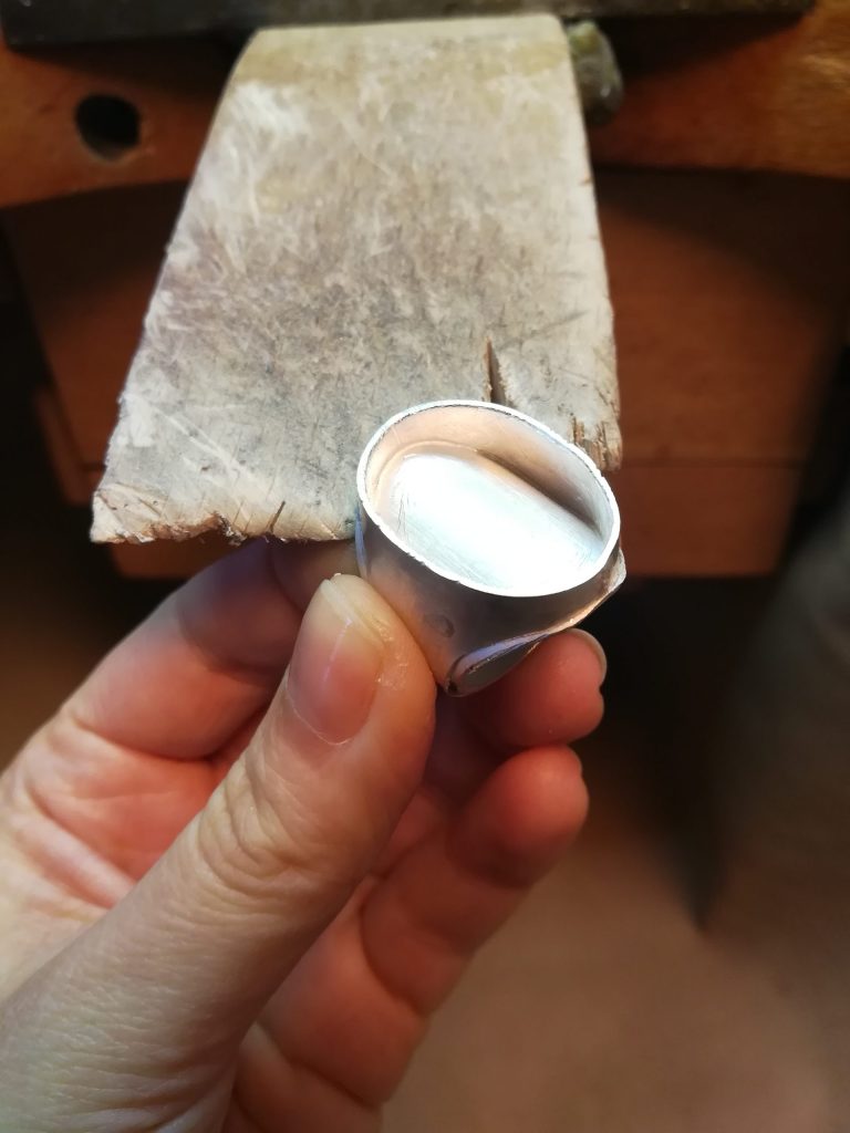 Den Ring-Rohbau und den Deckel lötete ich zusammen. Sobald alles richtig miteinander verlötet war, feilte ich den 1mm Rand ab. Anschließend feilte ich den Rest, brach die Kanten und schmirgelte die Oberfläche. Ich stempelte den Ring und er war fertig für die Fassarbeit.