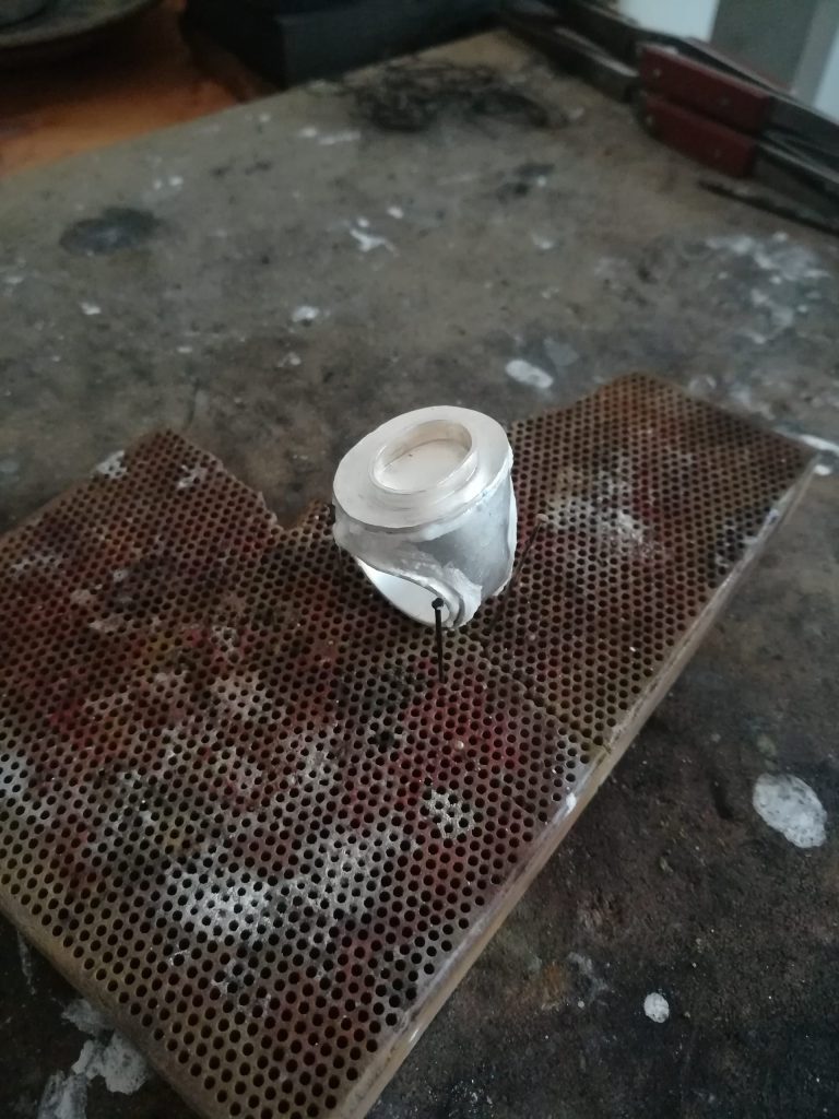 Das bereits ausgesägte Ovalblech legte ich in eine Bleianke. Hierbei achtete ich darauf, zwischen dem Blei (unedel) und dem Ovalblech (edler) immer ein Taschentuch zu legen, um eine Materialverbindung zu verhindern. Durch den Kugelpunzen und die Bleianke bekam ich die gewünschte Auftiefung. Den aufgetieften Deckel legte ich auf den Ring-Rohbau und passte mithilfe einer Zange die Biegungen am Rand an.