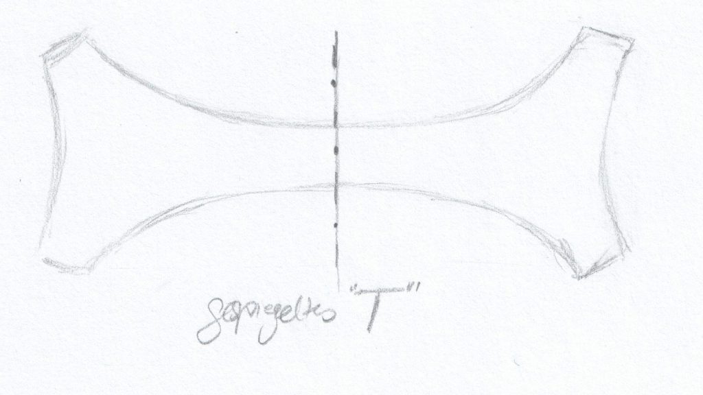 Das Schnittmuster für den Metallmantel erarbeitete ich mir mit einigen Skizzen. Die Grundform vom Muster bestand aus einem symmetrisch gespiegelten T und einem separten, ovalen „Deckel“. Ich klebte das Papiermuster auf ein Silberblech auf und sägte danach die Formen aus.