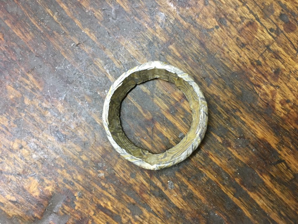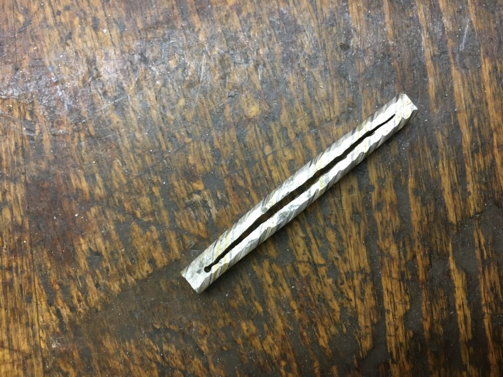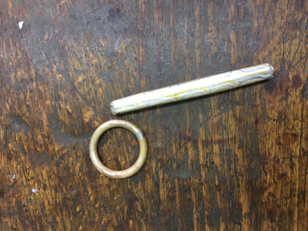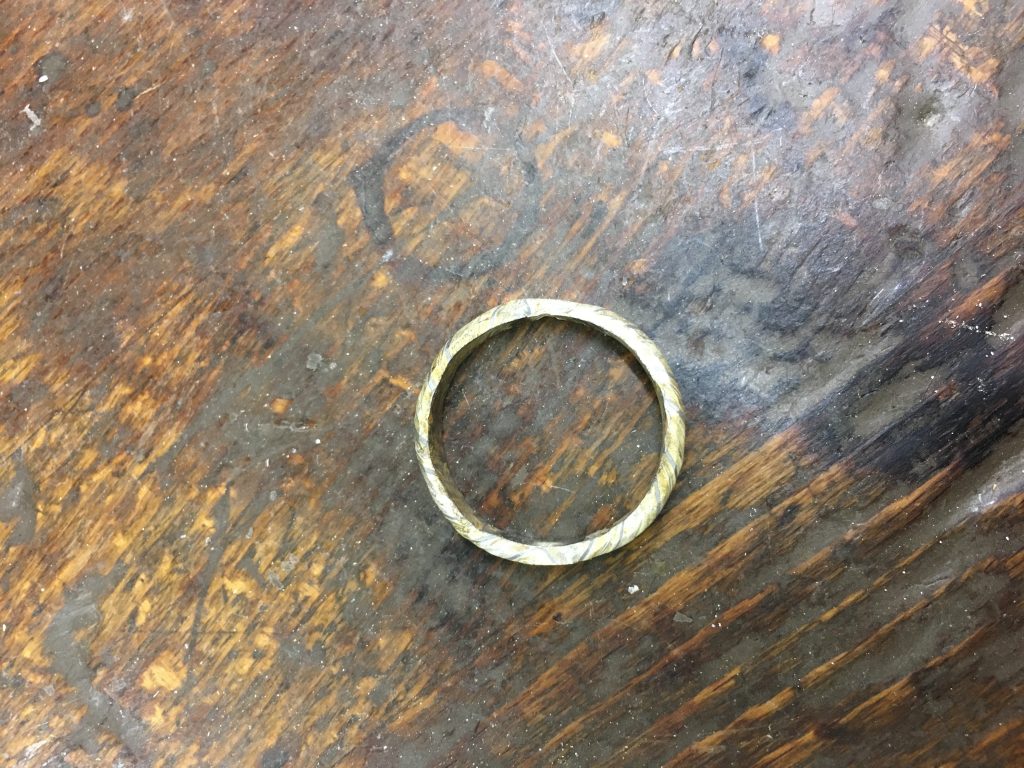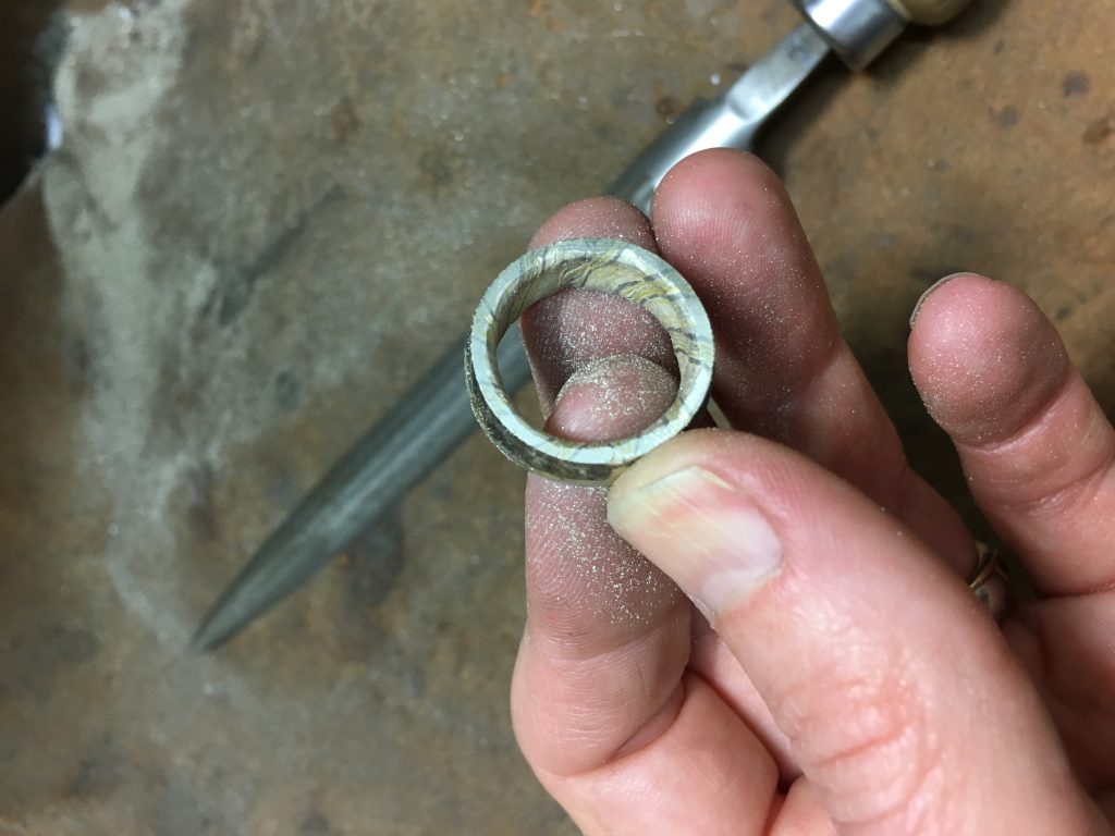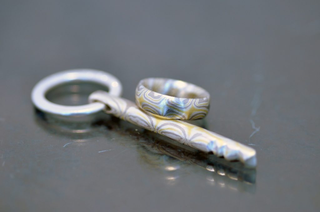 Die Lösung sieht so aus: Ich fertige in der Mokume Gane Technik einen „klassischen“ Trauring für die Braut und dazu, aus dem gleiche Material mit der gleichen Maserung den „Schlüssel zu ihrem Herzen“, das Schmuckstück, das der Mann nun immer bei sich trägt. Und auch dieser Schlüssel trägt natürlich die Gravur, die an einen Trauring gehört.