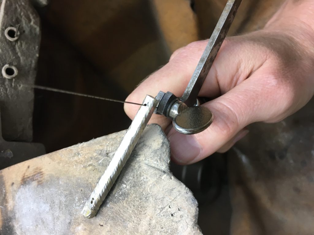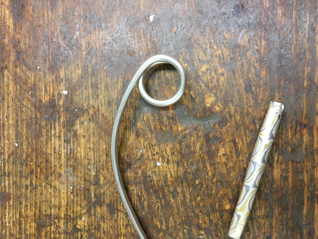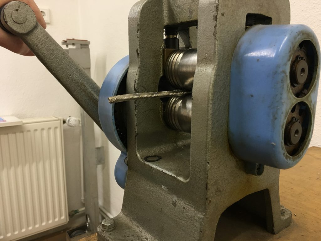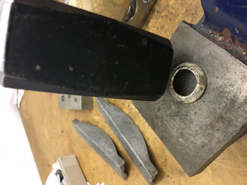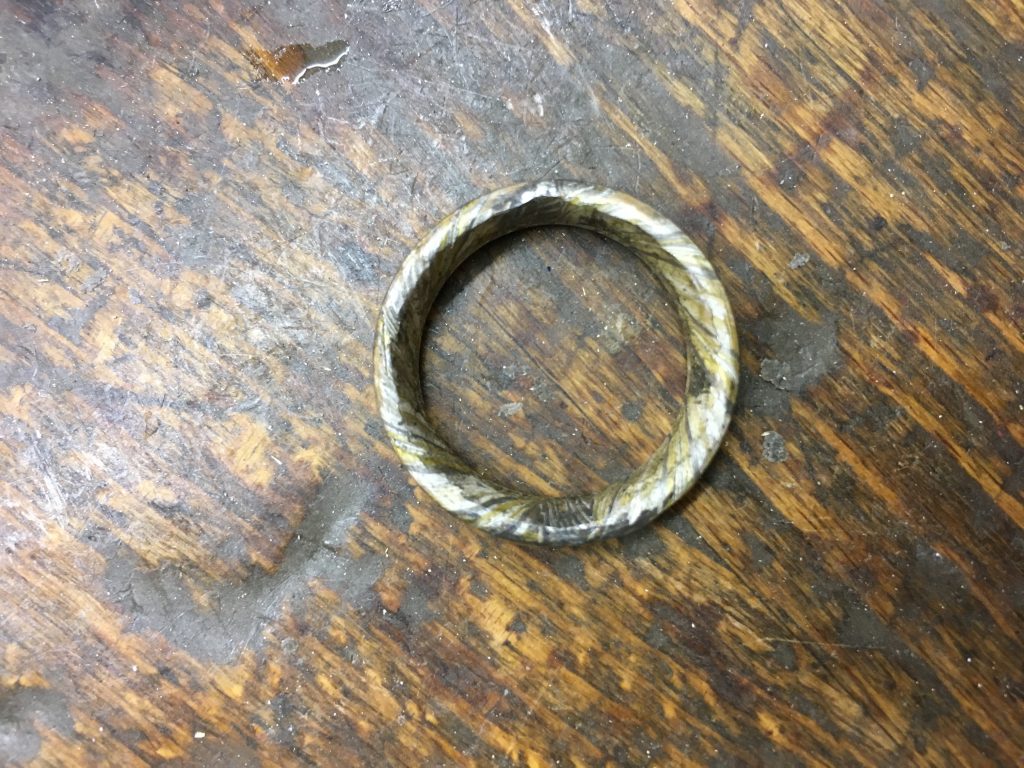 Die Lösung sieht so aus: Ich fertige in der Mokume Gane Technik einen „klassischen“ Trauring für die Braut und dazu, aus dem gleiche Material mit der gleichen Maserung den „Schlüssel zu ihrem Herzen“, das Schmuckstück, das der Mann nun immer bei sich trägt. Und auch dieser Schlüssel trägt natürlich die Gravur, die an einen Trauring gehört.