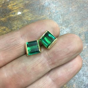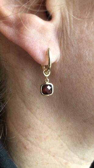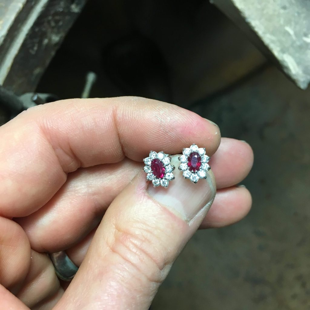 Dieses Pärchen besteht aus einem ovalen facettierten Rubin – umgeben von Brillanten. Den Anhänger hatte meine Kundin, die passenden Ohrringe, die hatten noch gefehlt.